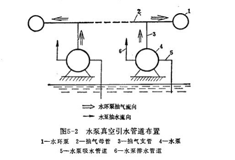 如果泵站中有兩臺(tái)以上的水泵,則可將水環(huán)式真空泵進(jìn)氣管與抽氣母管相通,每臺(tái)泵的泵殼頂部通過(guò)抽氣支管與抽氣母管相連。在每個(gè)支管上都安裝一個(gè)閥門,以便可以單獨(dú)對(duì)每一臺(tái)泵抽氣。有時(shí),為了備用起見,可以設(shè)置兩臺(tái)水環(huán)式真空泵,每一臺(tái)的進(jìn)氣管上都安上閥門。當(dāng)一臺(tái)發(fā)生故障時(shí),可以關(guān)閉該泵上的進(jìn)氣閥門,利用另外一臺(tái)抽氣,不致耽誤水泵的起動(dòng)。正常情況下兩臺(tái)水環(huán)式真空泵可對(duì)水泵同時(shí)抽氣,以加快引水速度。整個(gè)管路布置如圖5-2所示。