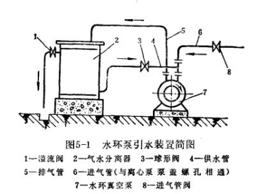 水環(huán)式真空泵引水裝置如圖5-1所示。水環(huán)式真空泵的進(jìn)氣管6與水泵泵蓋的頂部相連,在沒有自來(lái)水的地方,必須配置氣水分離器,作為真空泵冷卻水和補(bǔ)充水的水源。