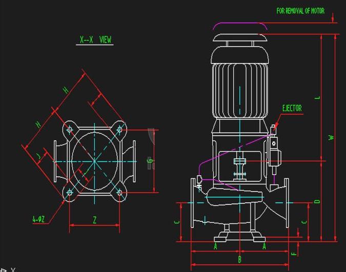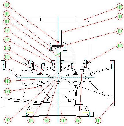 該泵為臥式單級單吸結(jié)構(gòu),主要有泵體,泵蓋,葉輪,泵軸,電機(jī)聯(lián)接架,剛性聯(lián)軸器,軸封,導(dǎo)軸承,泵座等組成。