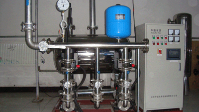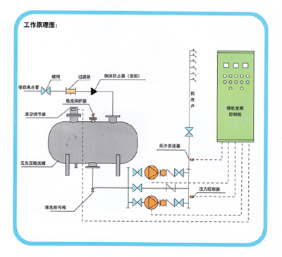 無負壓變頻供水設備的工作原理:自來水進入調節(jié)罐,罐內的空氣從真空消除器內排出,待水充滿后,真空消除器自動關閉。當自來水能夠滿足用水壓力及水量要求時,供水設備通過旁通止回閥向用水管網(wǎng)直接供水;當自來水管網(wǎng)的壓力不能滿足用水要求時,系統(tǒng)通過壓力傳感器(或壓力控制器、電接點壓表)給出起泵信號起動水泵運行。水泵供水時,若自來水管網(wǎng)的水量大于水泵流量,系統(tǒng)保持正常供水,用水高峰期時,若自來水管網(wǎng)水量小于水泵流量時,調節(jié)罐內的水作為補充水源仍能正常供水,此時,空氣由真空消除器進入調節(jié)罐,消除了自來水管網(wǎng)的負壓,用水高峰期過后,系統(tǒng)恢復正常的狀態(tài)。若自來水供水不足或管網(wǎng)停水而導致調節(jié)罐內的水位不斷下降,液位控制器給出水泵停機信號以保護水泵機組。夜間及小流量供水時可通過小型膨脹罐供水,防止水泵頻繁啟動。無負壓變頻供水設備關鍵技術部分為智能控制系統(tǒng)(變頻型)和調節(jié)罐的真空消除。