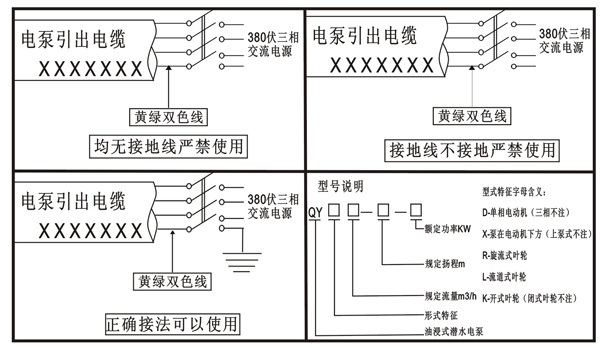 1、輸送水源的溫度小于40攝氏度; 2、PH值為6.5-8.5之間, 3、水中含固體雜質(zhì)比不超過(guò)0.1%,粒度不大于0.2mm; 4、潛水泵使用揚(yáng)程不能過(guò)低,低于規(guī)定揚(yáng)程的80%容易引起熱保護(hù)器工作,使電泵停止運(yùn)行,甚至造成電機(jī)損壞; 5、電源電壓使用范圍在342V-420V之間,且三相電壓必須平衡,如使用地距電源較遠(yuǎn),需加長(zhǎng)電源輸送線,那么電源線的截面積必須大于電泵電纜線的截面積即(1.5平方毫米以上),使電壓穩(wěn)定在342V-420V之間。 6、三相電泵不得缺相使用,請(qǐng)加裝過(guò)電流和漏電保護(hù)器。
