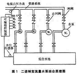 圖1是運(yùn)用二進(jìn)制變流量水泵組合穩(wěn)壓給水方法構(gòu)造的系統(tǒng)示意圖。