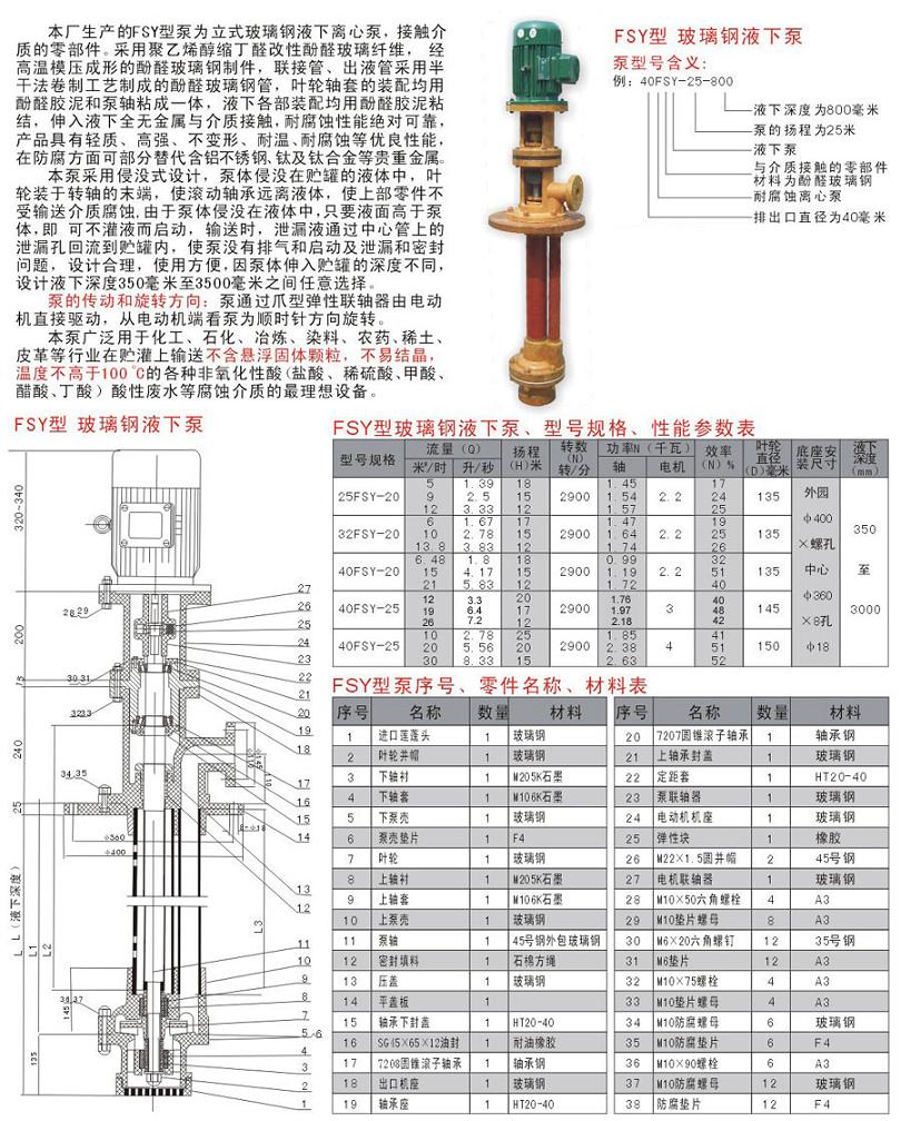玻璃鋼(酚醛樹脂)對非氧化性酸(鹽酸、稀硫酸、磷酸等)、鹽類溶液、水都有良好的耐蝕性,不耐堿和氧化性酸(硝酸、鉻酸等)的腐蝕,高耐溫度約為120~150℃,低溫度為-20℃。本單位應(yīng)用此材料生產(chǎn)的SY型立式玻璃鋼液下泵、WSY型泵為立式玻璃鋼液下旋渦泵、FSY型泵為立式玻璃鋼液下離心泵。該泵因伸入貯罐,貯槽的深度長短不同,設(shè)計液下深度500mm--3000mm之間任意選擇。只要液體高于泵體,即可不灌液而起動送液,平蓋板下設(shè)有泄漏孔,液體不會向貯罐外泄漏。