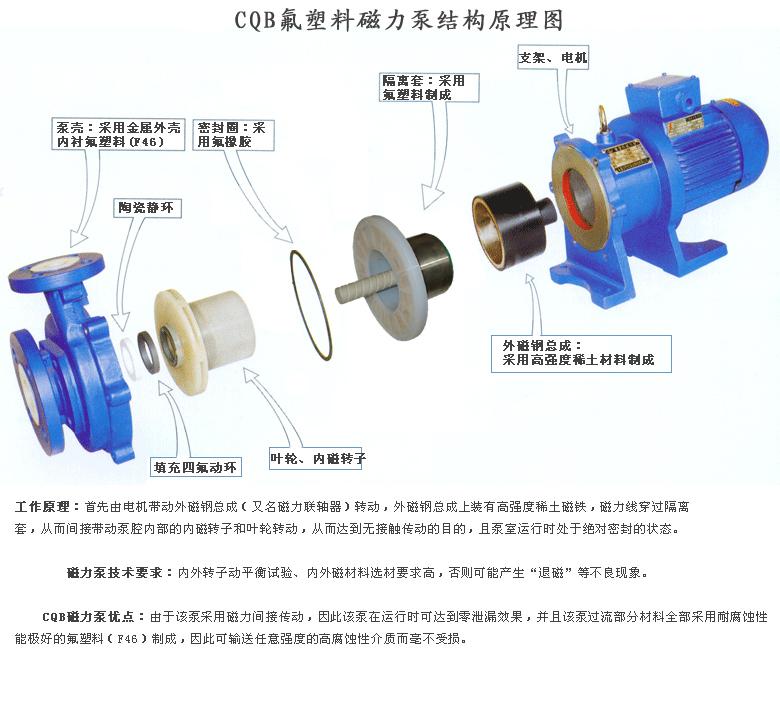 CQB氟塑料磁力泵由泵、磁力傳動器、電動機(jī)三部分組成。關(guān)鍵部件磁力傳動器由外磁轉(zhuǎn)子、內(nèi)磁轉(zhuǎn)子及不導(dǎo)磁的隔離套組成。當(dāng)電動機(jī)帶動外磁轉(zhuǎn)子旋轉(zhuǎn)時,磁場能穿透空氣隙和非磁性物質(zhì),帶動與葉輪相連的內(nèi)磁轉(zhuǎn)子作同步旋轉(zhuǎn),實現(xiàn)動力的無接觸傳遞,將動密封轉(zhuǎn)化為靜密封。由于泵軸、內(nèi)磁轉(zhuǎn)子被泵體、隔離套完全封閉,從而徹底解決了“跑、冒、滴、漏”問題,消除了煉油化工行業(yè)易燃、易爆、有毒、有害介質(zhì)通過泵密封泄漏的安全隱患,有力地保證了職工的身心健康和安全生產(chǎn)。