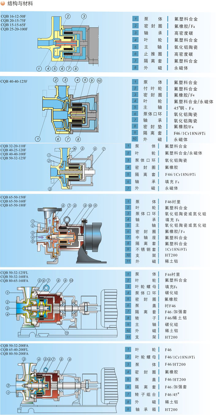 七、氟塑料磁力泵結(jié)構(gòu)與材料: