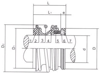 | 1.橡膠波紋管 2.后緊圈 3.彈簧 4.前緊圈動(dòng)環(huán) 6.靜環(huán) 7.靜環(huán)密封墊 | |