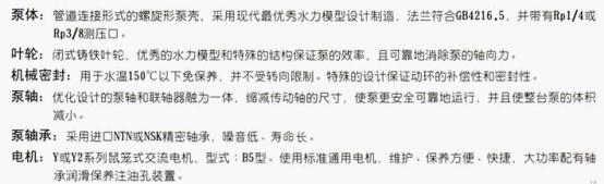 2、輸送介質(zhì)為清水或物理化學(xué)性質(zhì)類似清水的其它液體。(輸送介質(zhì)帶有細(xì)小顆粒的應(yīng)在訂貨時(shí)另行說明,以便裝配耐磨式機(jī)械密封)。