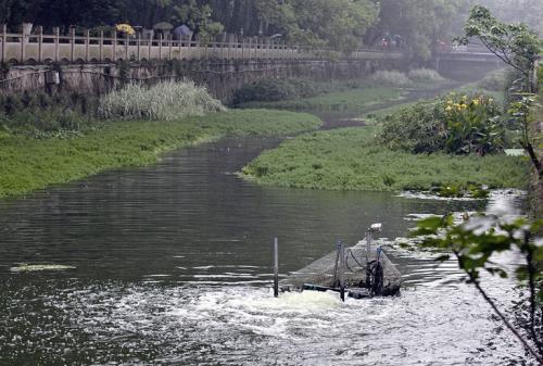 溫州市區(qū)九山外河中,一臺(tái)潛水離心式曝氣機(jī)正在工作,產(chǎn)生涌泉般的水流像“趵突泉”,給河面增添了幾分生氣。 這種造流曝氣機(jī)工作時(shí)能給河水充氧,提高水體溶解氧的濃度,增強(qiáng)水體的自凈能力,以改善水質(zhì)。在長約1公里的九山外河,共有20套造流曝氣機(jī),每天工作8小時(shí)。此外,外河道里還種植了旱傘草、美人蕉等挺水植物,以及睡蓮等浮水植物,共同組成河道的生態(tài)修復(fù)工程。