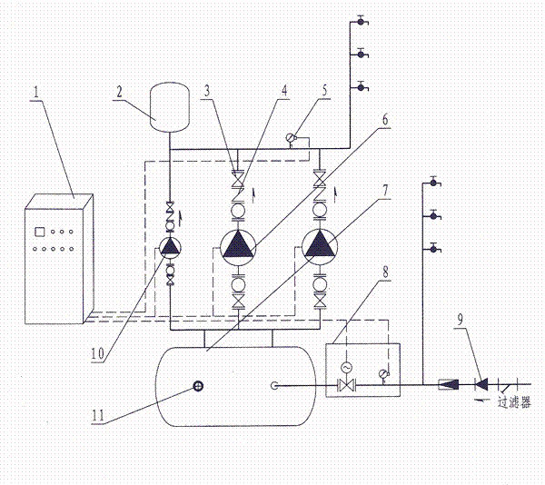 供水設(shè)備是我公司技術(shù)人員結(jié)合多年管網(wǎng)疊壓供水設(shè)備研究經(jīng)驗(yàn)設(shè)計(jì)而成的新一代智能型成套無(wú)負(fù)壓穩(wěn)流給水設(shè)備,采用智能變頻控制柜控制。其組成及工作原理如下圖: