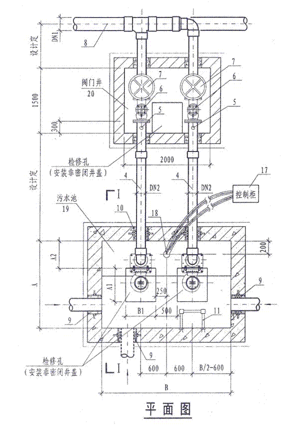 說明:1.本圖潛水排污泵采用液位自動控制。兩臺泵輪換工作,互為備用。h1為開泵水位,h0為停泵水位,當水位高出報警水位100mm時備用泵自投。