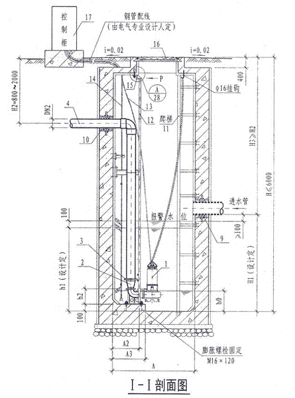 4.潛水排污泵控制柜安裝位置由單項工程設計考慮,其型號規(guī)格可由泵廠配套供應。池外電線電纜應穿管敷設。