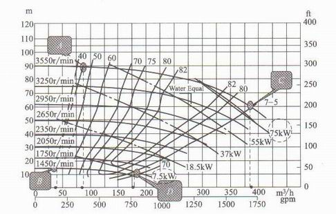在變轉(zhuǎn)速下泵的小流量限制是有眾多不同速度下的泵的性能曲線上左側(cè)的小流量限制點(diǎn)所形成的一條小流量限制線(由A、B 兩點(diǎn)連成的線),如圖1所示。在變轉(zhuǎn)速下泵的大流量限制是由眾多不同轉(zhuǎn)速下的泵性能曲線上右端的限制點(diǎn)所形成的一條限制線(如由C 、D兩點(diǎn)連成的線)。