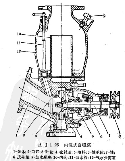 內(nèi)混式自吸泵如圖所示,吸水室是向上傾斜的,可使泵內(nèi)保持一定量的存水,泵出口處有氣水分離室,具有較大的過水面積,以造成氣水分離。在吸水室上方,開有回流孔與氣水分離室相通,形成循環(huán)水的通道�;亓骺滋幯b有手動回流閥,自吸過程中打開,待正常出水后關閉。其他結構與懸架式泵相通。