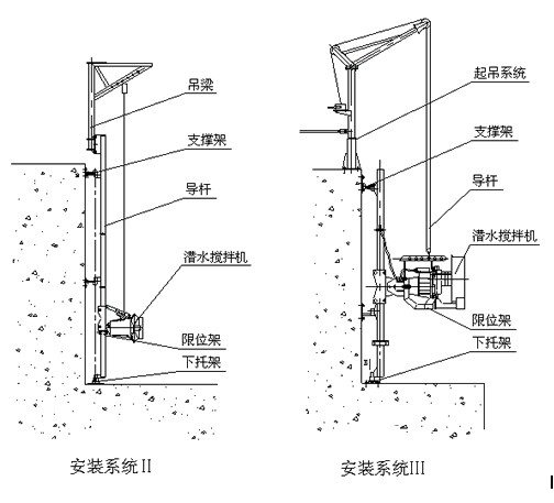 安裝系統(tǒng)Ⅰ只適用池深<4m,機型為QJB0.85/8-260/3-740C和QJB1.5/6-260/3-980C攪拌機,其中Ⅰ-1可在水平方向和垂直方向進行調(diào)節(jié);