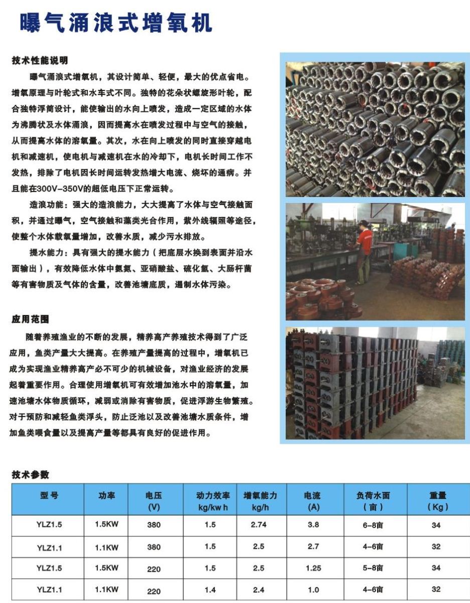 曝氣涌浪式增氧機(jī)是目前水產(chǎn)養(yǎng)殖增氧設(shè)備中新的產(chǎn)品,其設(shè)計(jì)大的優(yōu)點(diǎn)是省電。增氧原理與葉輪式和水車式不同,獨(dú)特的花朵狀螺旋形葉輪配合環(huán)形浮筒,能使輸出的水向上噴發(fā),造成一定區(qū)域的水體為沸騰狀,因而提高水體在噴發(fā)過(guò)程中與空氣的接觸,從而提高水體的溶氧量。同時(shí)水在向上噴發(fā)時(shí)直接穿越電機(jī)和減速機(jī),使電機(jī)與減速機(jī)在水的冷卻下實(shí)現(xiàn)長(zhǎng)時(shí)間工作不發(fā)熱,排除了電機(jī)因長(zhǎng)時(shí)間運(yùn)轉(zhuǎn)導(dǎo)致的發(fā)熱、電流增大、燒壞的通病,并且能在300—350瓦的超低電壓下正常運(yùn)轉(zhuǎn)。