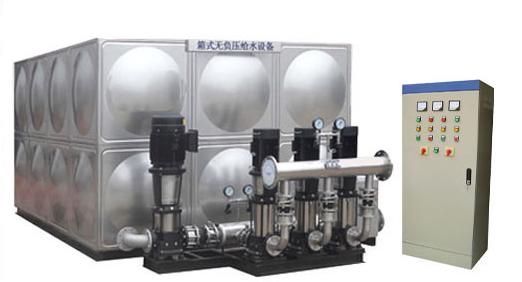 箱式管網(wǎng)疊壓供水設(shè)備(無(wú)負(fù)壓增壓水箱)是由水箱,防倒流裝置(根據(jù)需要設(shè)置),防負(fù)壓裝置,水泵機(jī)組,限壓保護(hù)裝置,膨脹罐(根據(jù)需要設(shè)置),控制儀表,控制柜,閥門(mén),管路系統(tǒng),配套附件等組成,從供水管網(wǎng)直接吸水,通過(guò)壓力傳感器檢測(cè)出壓力,將檢測(cè)值和設(shè)定值進(jìn)行比較,計(jì)算出在市政自來(lái)水管網(wǎng)的原有壓力的基礎(chǔ)上需要增加的壓力值,確定水泵投入臺(tái)數(shù)和變頻器輸出頻率,調(diào)整水泵的轉(zhuǎn)速以符合用水曲線實(shí)現(xiàn)恒壓供水或變壓供水。水箱式管網(wǎng)疊壓供水設(shè)備(自動(dòng)增壓水箱)大程度利用了市政管網(wǎng)自來(lái)水的原水壓力,對(duì)市政管網(wǎng)不產(chǎn)生負(fù)壓,系統(tǒng)會(huì)定時(shí)定量或在管網(wǎng)供水量不足時(shí)自動(dòng)切換到水箱內(nèi)吸水,設(shè)備選用不銹鋼水箱和管件,減少了用水的二次污染,是新一代供水領(lǐng)域的節(jié)能產(chǎn)品。