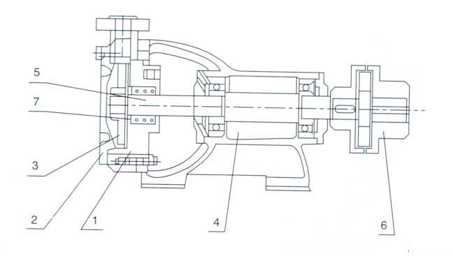 W型分聯(lián)式旋渦泵的主要零件(見(jiàn)結(jié)構(gòu)圖)有(1)泵(2)泵蓋(3)葉輪(4)托架結(jié)合體(5)泵軸(6)爪型彈性聯(lián)軸器(7)特別組合體機(jī)械密封。該型泵與電機(jī)合裝在同一底座上.進(jìn)、出口方向?yàn)樾辫上.經(jīng)接彎管可変為垂直向上。葉輪在軸上能夠自由地作軸向移動(dòng),泵在工作中葉輪能自行調(diào)節(jié)好與泵體和泵蓋之間的間隙。