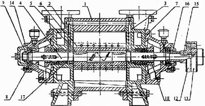 1.泵體 2.后蓋 3.前蓋 4.泵軸 5.平鍵 6.葉輪 7.軸承瓦架 8.滾珠軸承 9.園螺母 12.泵聯(lián)軸器 13.電機聯(lián)軸器 14.軸承蓋 15.鍵 16.定位圈 17.軸套 18.填料壓蓋 |