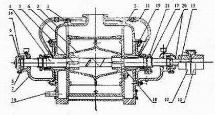 1.泵體 2.后蓋 3.前蓋 4.泵軸 5.平鍵 6.葉輪 7.軸承瓦架 8.滾珠軸承 9.園螺母 10.進水管 11.水封管 12.泵聯(lián)軸器 13.電機聯(lián)軸器 14.軸承蓋 15.鍵 17.軸套螺母 18.軸套 19.填料涵 20.毛氈圈 21填料函壓蓋 |