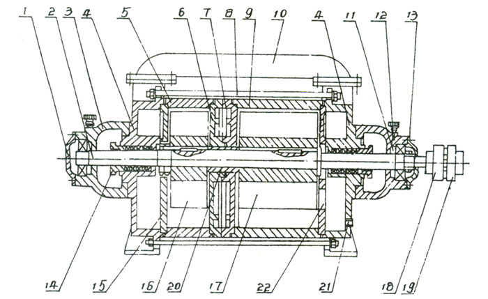 | 1、后軸承壓蓋 2、軸 3、軸承架 4、前后端蓋 5、短泵體 6、中間壁(B) 7、中間壁(A) 8、拉緊螺栓 9、長(zhǎng)泵體 10、連通管 11、調(diào)整墊 12、油杯 13、前軸承壓蓋 14、填料壓蓋 15、后蓋園盤 16、短葉輪 17、長(zhǎng)葉輪 18、泵聯(lián)軸器 19、電機(jī)聯(lián)軸器 20、軸套 21、進(jìn)水孔 22、前蓋園盤 |