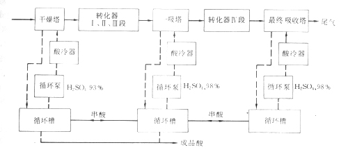 干燥吸收工段是將經(jīng)過凈化的含S02原料氣轉(zhuǎn)化成S03氣后,再由濃流酸吸收制成成品酸,其工藝流程見圖2-108。