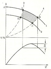 離心泵性能曲線圖上每個(gè)點(diǎn)對(duì)應(yīng)一個(gè)工況,離心水泵在高效率點(diǎn)工作是理想的,但這一要求并不現(xiàn)實(shí),一般是規(guī)定一個(gè)工作范圍,如圖2 4中的曲線1巾的AB段,在此范圍內(nèi)泵運(yùn)行的效率下降不大。通過(guò)改變轉(zhuǎn)速或切割葉輪也叫擴(kuò)大泵的運(yùn)行機(jī)制范圍,曲線2即是改變轉(zhuǎn)速或切割葉輪前后的特性曲絨.曲線3、4是改變轉(zhuǎn)速速的相似拋物線或是切割外徑的切割線(拋物線)。方塊ABCD稱為泵擴(kuò)大r的工作范圍,泵町以在此范同的任·點(diǎn)工作,而且效率下降多不會(huì)超過(guò)5%~8%。把許多泵的工作范圍畫(huà)在一張坐標(biāo)圖中.稱為型譜。為了使圖形協(xié)調(diào).高揚(yáng)程和大流量時(shí)的工作范圍不致過(guò)大(因高揚(yáng)程大流量的工作范圍相對(duì)變大),通常采用對(duì)數(shù)坐標(biāo)表示。一般每種系列泵有一個(gè)型譜。