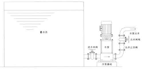蓄水池自灌引水方式布置的水泵運(yùn)行原理如下圖,一般水泵與蓄水池均布置于地面以上,蓄水池內(nèi)水位必須高于水泵出口端排氣孔,以保證水泵起動(dòng)之前蓄水池內(nèi)的水能自動(dòng)灌入水泵泵腔,并將泵腔內(nèi)的空氣排盡。這種安裝方式水泵的進(jìn)水口需安裝一只閥門,當(dāng)水泵故障需要拆下維修或更換時(shí),可將閥門關(guān)閉,以防止蓄水池內(nèi)水外泄。