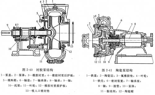 襯膠泵結(jié)構(gòu)如圖2-40所示。其大流量可達1500m3/h,大揚程可達50 m,高使用溫度80℃,高使用壓力1.6 MPa。襯膠泵能用于輸送硫酸、鹽酸、磷酸、氫氟酸、氫氧化鉀等強腐蝕性介質(zhì),并適合輸送含有顆粒的腐蝕性液體,但不能用于輸送濃硫酸、濃硝酸等強氧化性酸。