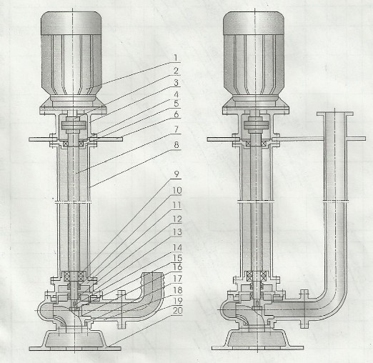 1、電機(jī);2、聯(lián)軸器;3、電機(jī)座;4、上軸承;5、上軸承座;6、安裝盤;7、加長軸;8、支撐管;9、下軸承;10、上機(jī)械密封;11、油室;12、機(jī)械密封;13、后蓋板;14、鍵;15、葉輪螺母;16、葉輪;17、密封環(huán);18、泵體;19、出水管;20、底盤