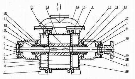 1.端蓋 2.后吸排氣園盤 3.葉輪 4.軸承架 5.園螺母 6.后軸承壓蓋 7.軸 8.軸承 9. 后軸套10.填料壓圈 11.填料 12.填料壓圈 13.平鍵 14.泵體 15.連通管 16.前吸排氣園盤 17.前軸套 18.聯(lián)軸器具 19.平鍵 20.園螺母 21.前軸承壓蓋